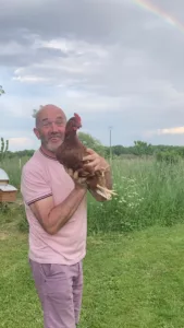 Attaché à l’harmonie entre l’humain et la nature, il cultive de bons légumes, prend soin des poules, des canards, des chevaux, ainsi que du chat et du chien qui font partie intégrante de la vie du lieu.
